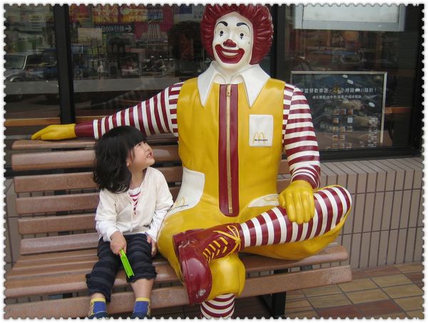 陪媽媽產檢完的豆豆,開心主動地要求要跟麥當勞叔叔一起拍照