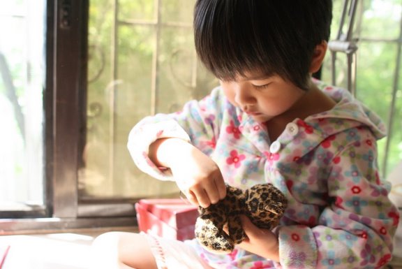 豆豆自己將破掉的小豹玩偶縫好了 挺厲害的豆豆,第一次拿針縫補東西 沒有刺到自己的手也將破洞縫好了 神清專注地縫著她還挺喜歡的小豹