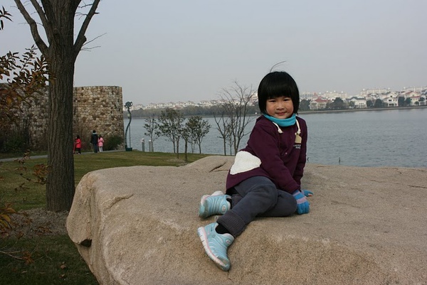 以前的豆豆跟石頭拍照時,都是呈現四肢成大字行站在石頭上
