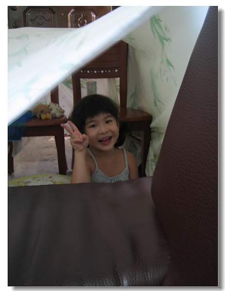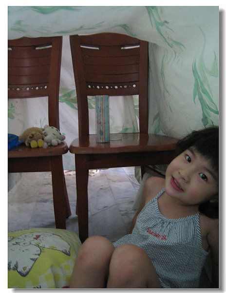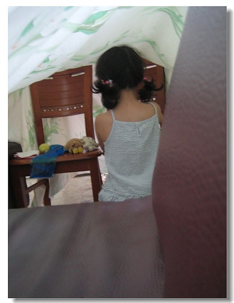 後來,媽媽拿出一塊薄床單與兩張椅子,幫她搭出一個近乎密閉的秘密基地,